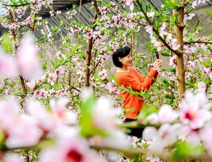 走進(jìn)溫室大棚,室內(nèi)氣溫已經(jīng)達(dá)到十八攝氏度,滿眼的桃花讓人為之一振。一株株整齊排列的桃樹上開滿粉色的花朵,陽光透過大棚灑射進(jìn)來,讓桃花的顏色顯得更為明艷動(dòng)人。人在花中游,一派溫馨浪漫美好的景象,給冬日里人們的心靈添上濃墨重彩的一筆。游客張亞迪說:“這不是春節(jié)假期嘛,我們正好休年假期間,聽說楊柳青這邊有桃花棚,就過來桃花,還不錯(cuò)?!?/p>
